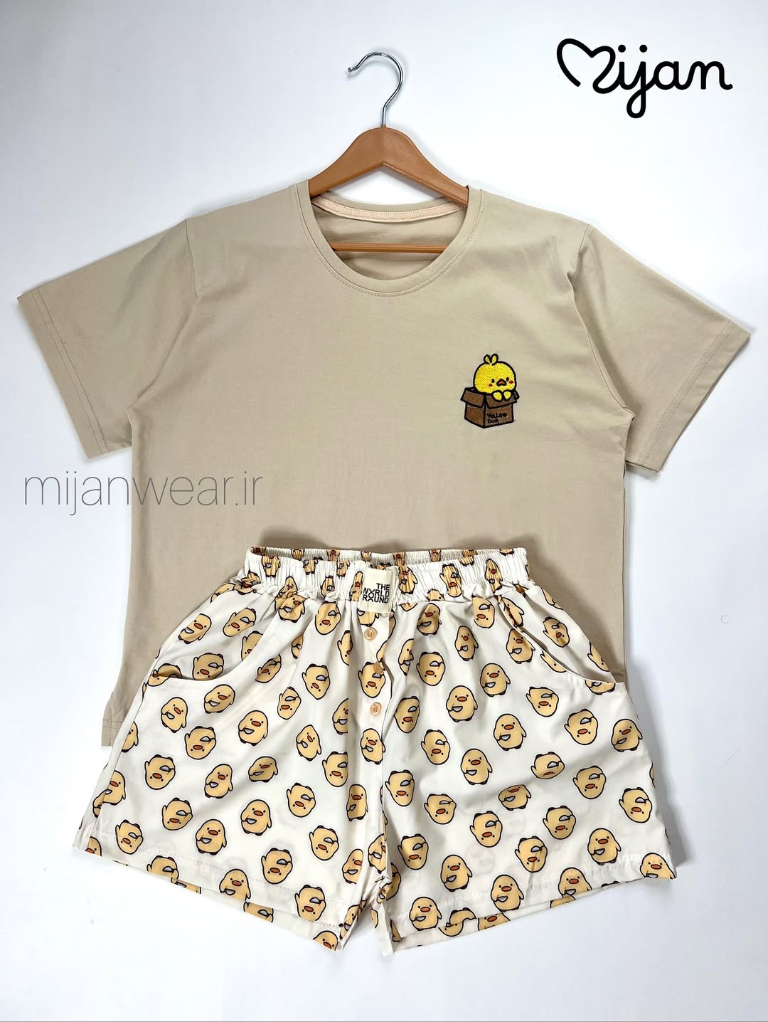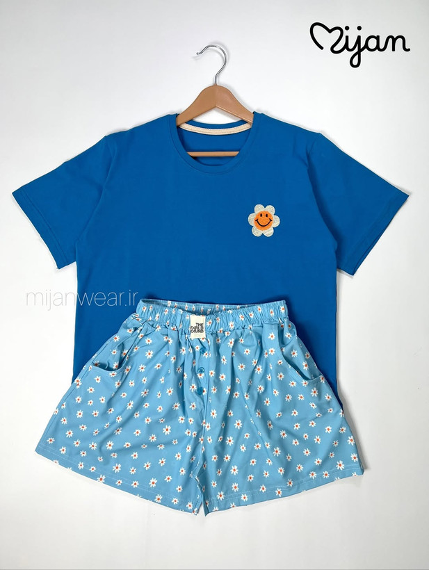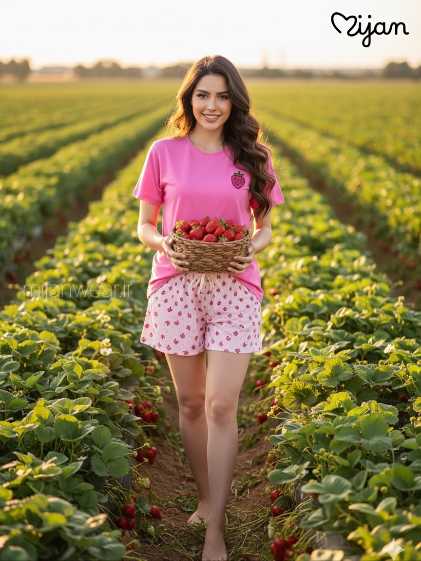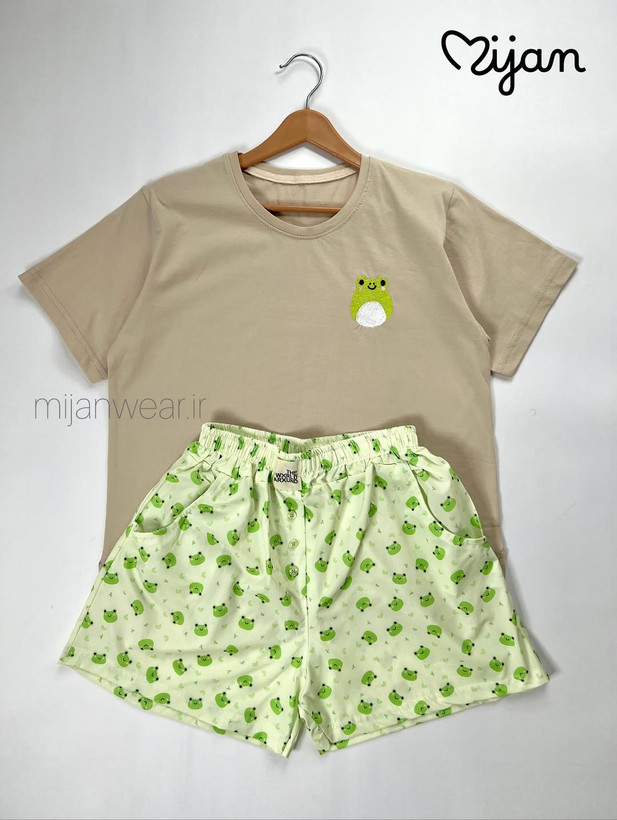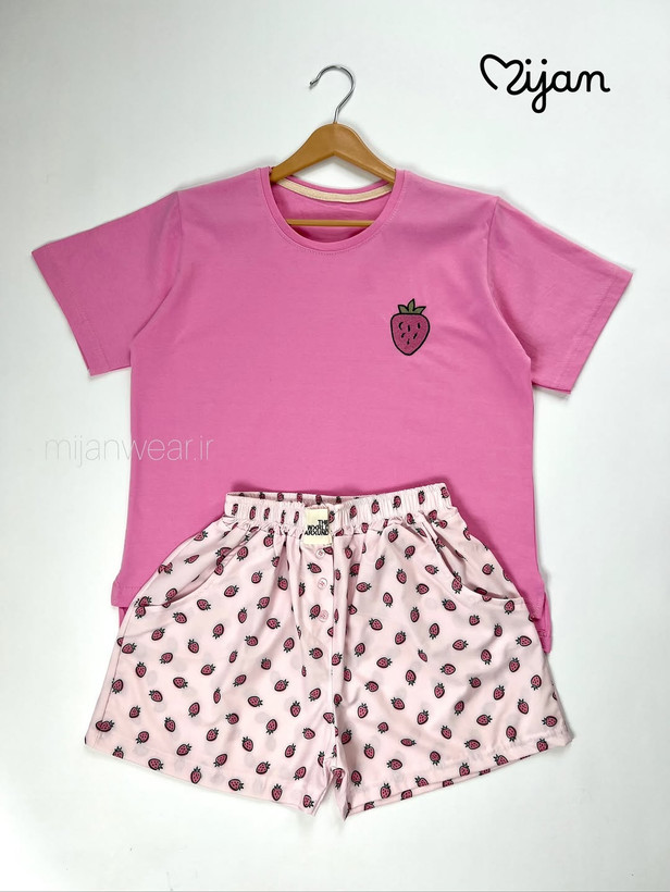 ست میوه ای شامل تیشرت نخ و پنبه و شورتک کرپ. تیشرت با قد ۵۵، دور سینه ۱۱۰ و شورتک با قد ۳۷، دور ران ۶۰ و دور کمر کشسانی ۱۲۰