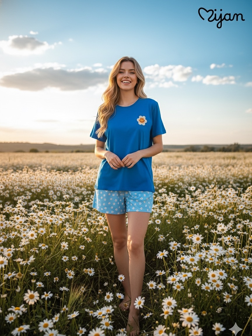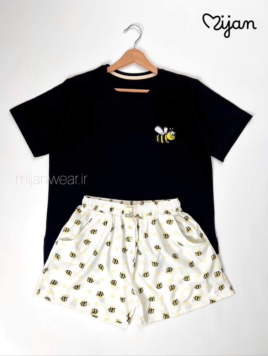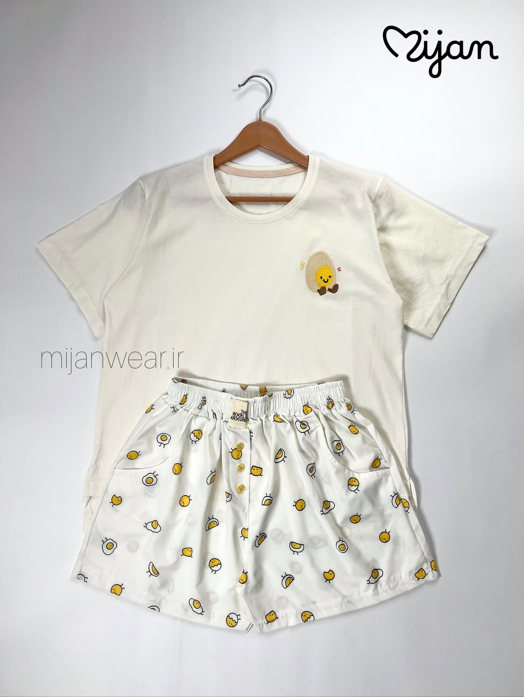 ست میوه ای شامل تیشرت نخ و پنبه و شورتک کرپ. تیشرت با قد ۵۵، دور سینه ۱۱۰ و شورتک با قد ۳۷، دور ران ۶۰ و دور کمر کشسانی ۱۲۰